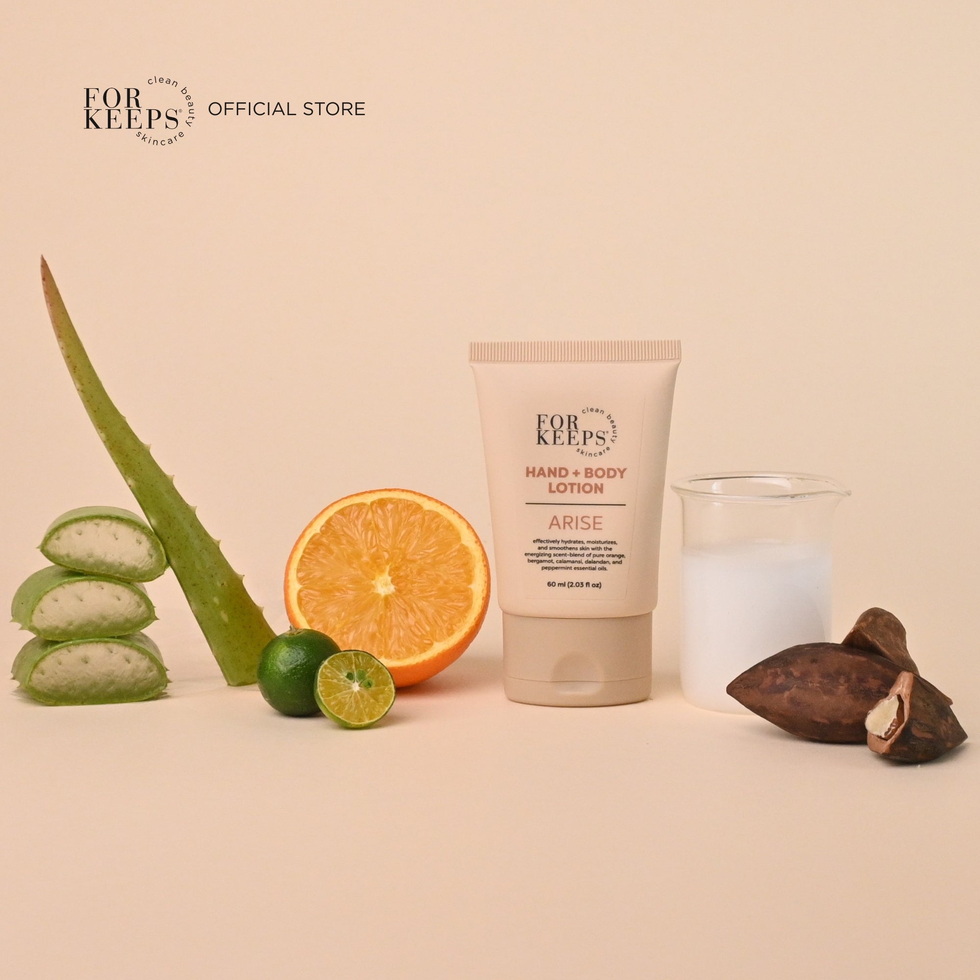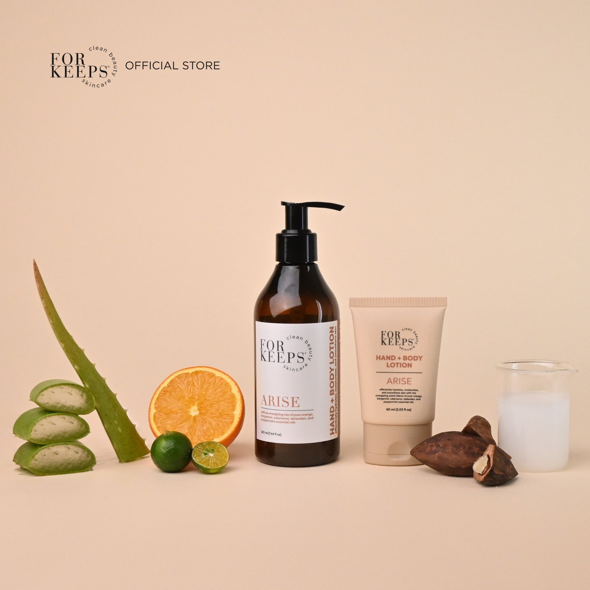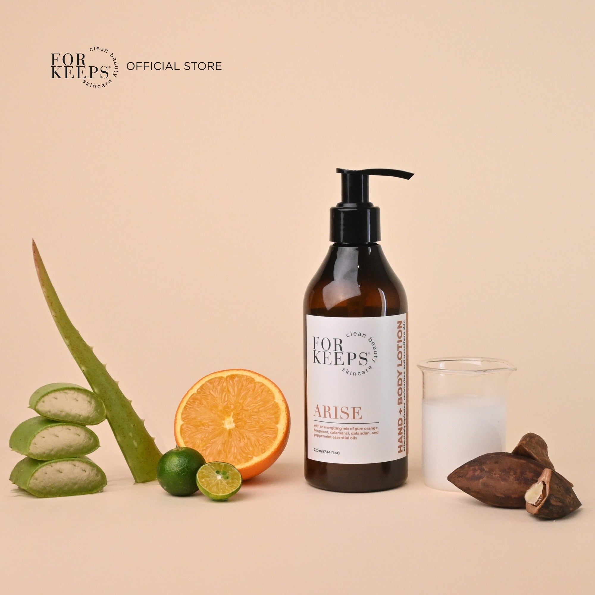 Compared to many lotions that would count on mineral oil, paraffin wax, synthetic emulsifiers, and toxic preservatives, our turns to superpowers of beautiful raw wet-milled VCO, cold pressed Pili nut oil, and MCT for both nourishing benefits and quick active ingredient delivery deep into the skin. Aloe Vera soothes and moisturizes our thirsty skin with hyaluronic acid, keeping it supple healthy, and protected. Essential oils bring the same aromatherapeutic benefits you enjoy through other For Keeps products and we are exceptionally proud of our olive oil-derived emulsifier and ecocert preservative.