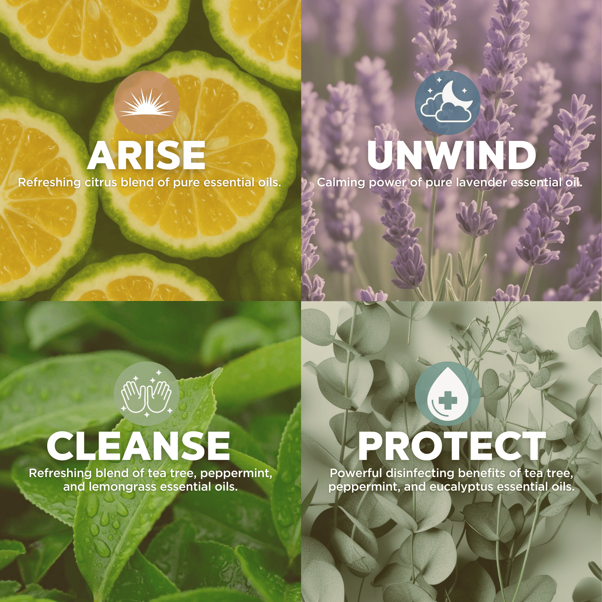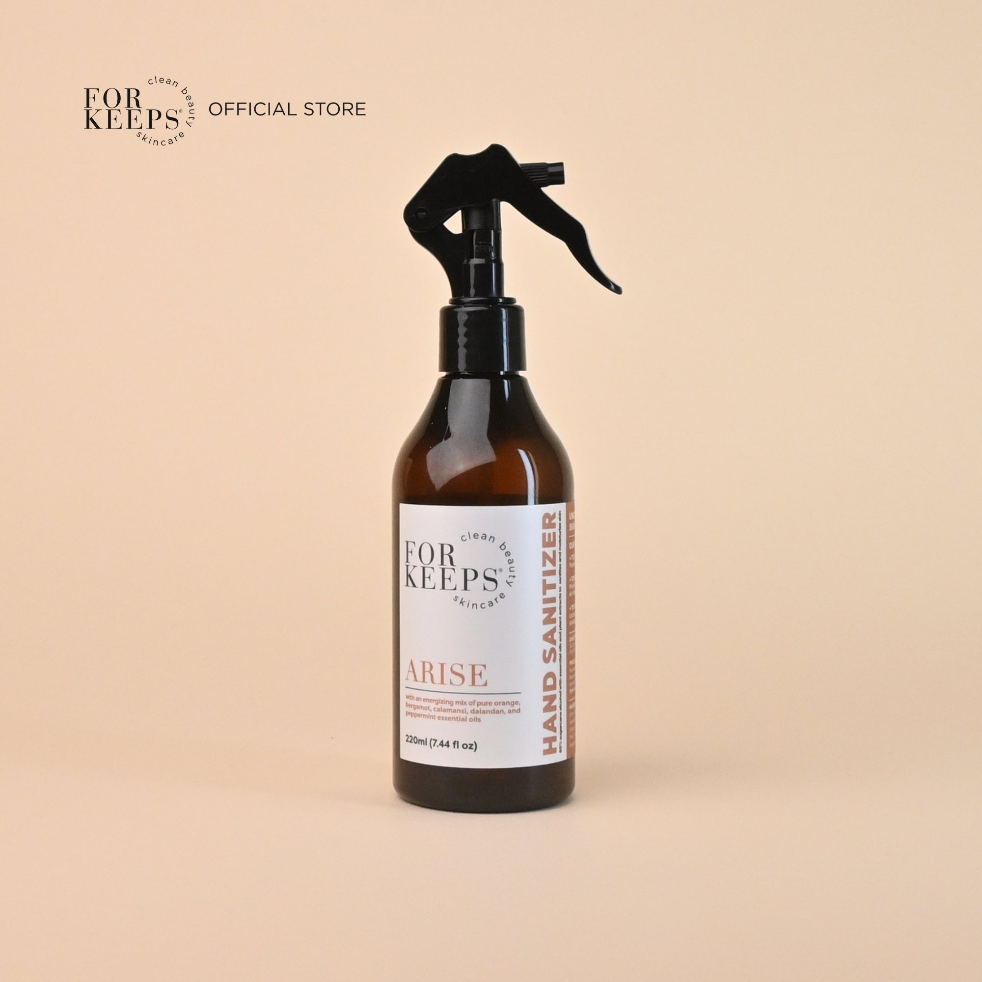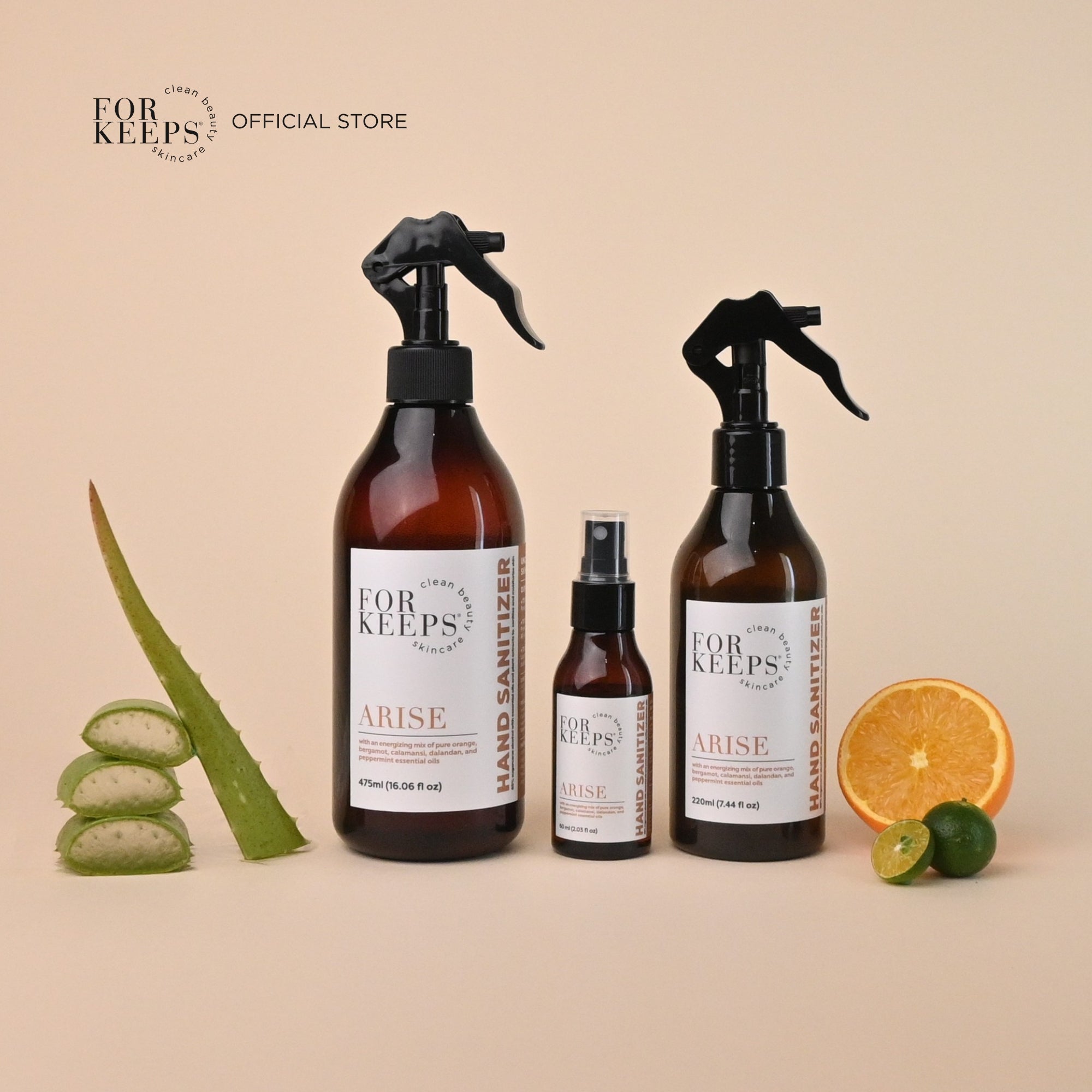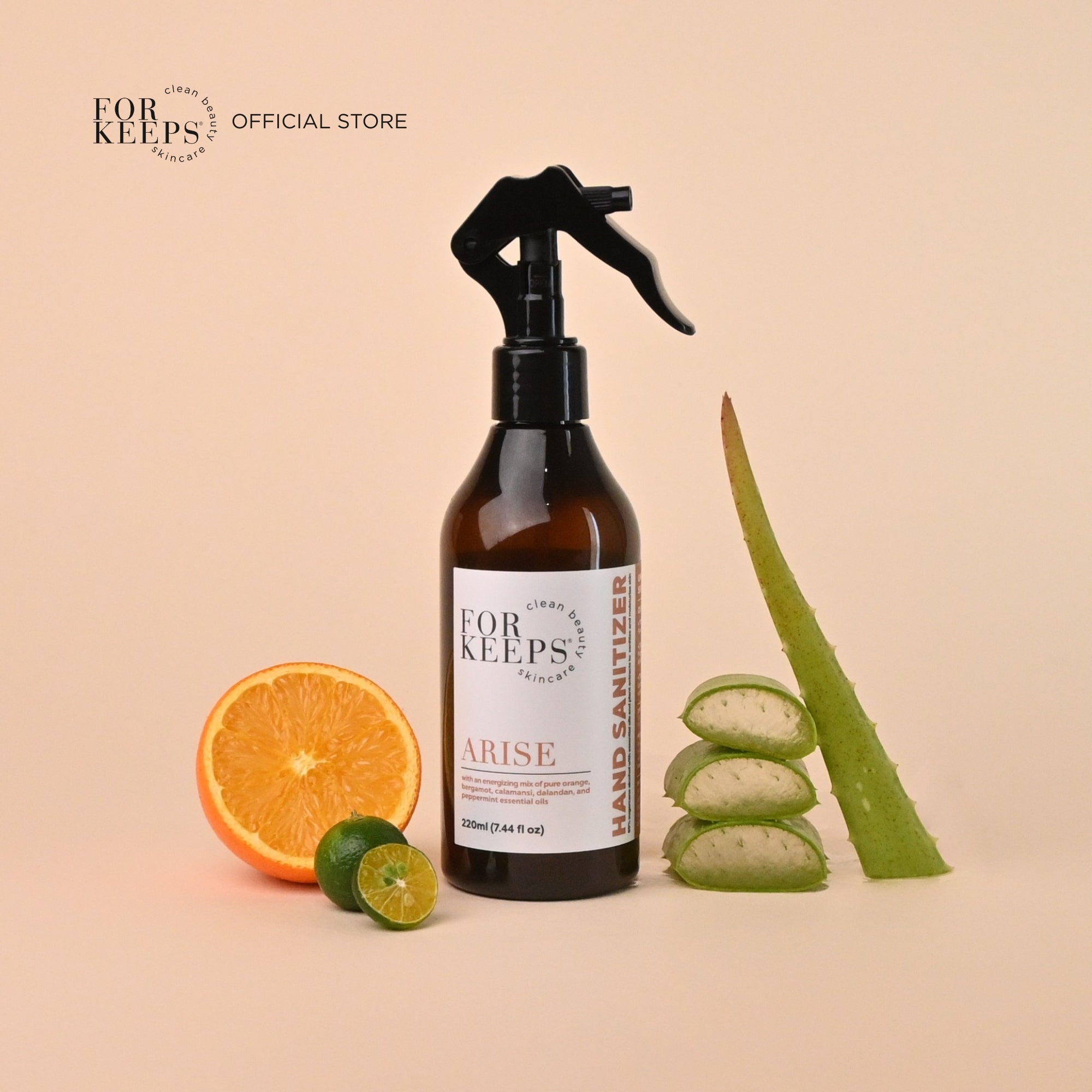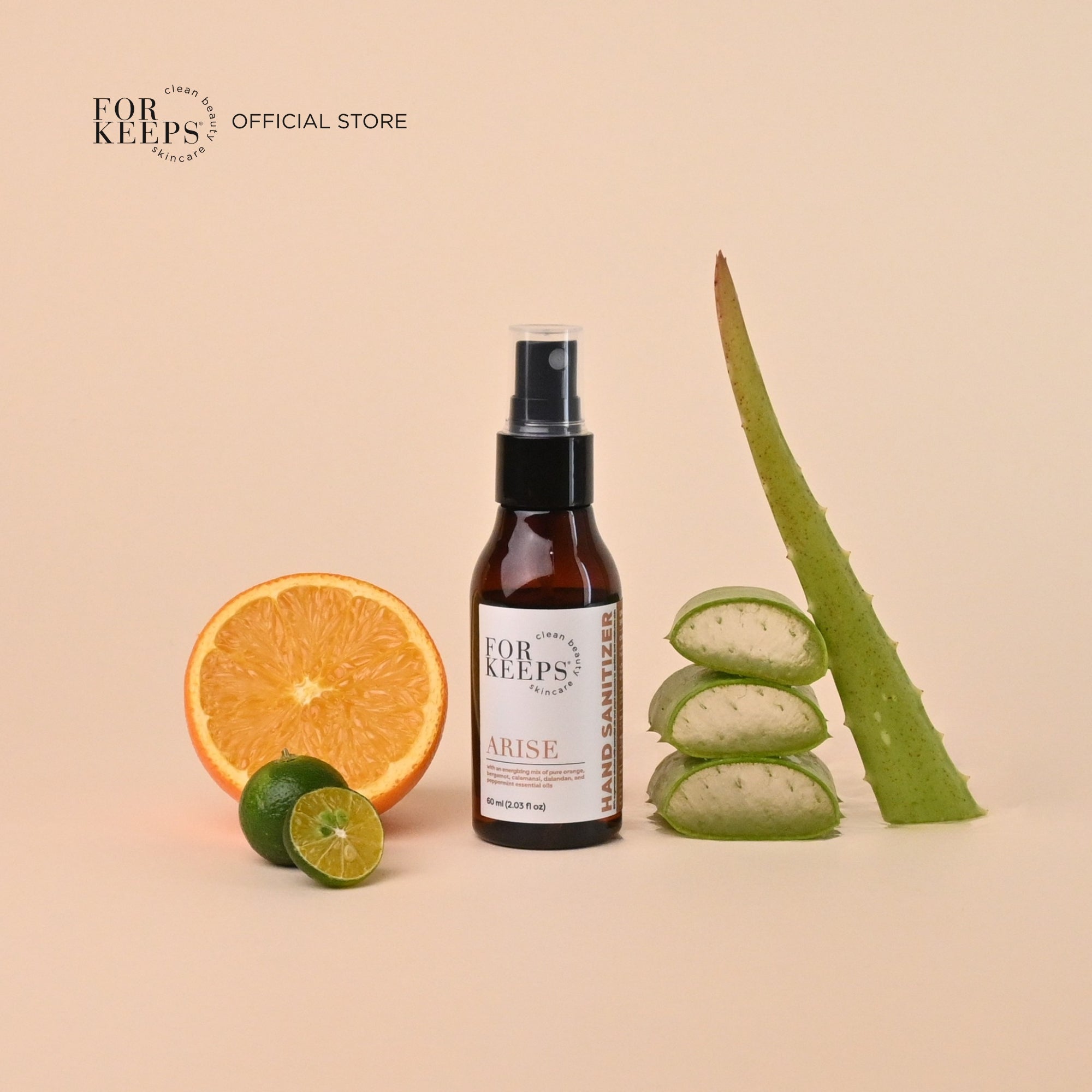 Arise is a revitalizing and high-performing sanitizer formulated with 65% sugarcane alcohol, combined with an energizing mix of pure orange, bergamot, calamansi, dalandan, and peppermint essential oils.